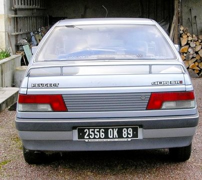 | Vues AV et AR. On distingue les phares jaunes. Les lignes tendues, sur toute la voiture, présentent un certain équilibre. La voiture a conservé son immatriculation d'origine (avril 1988) en plaques noires. L'aileron est additionnel et procure un petit plus esthétiquement. |