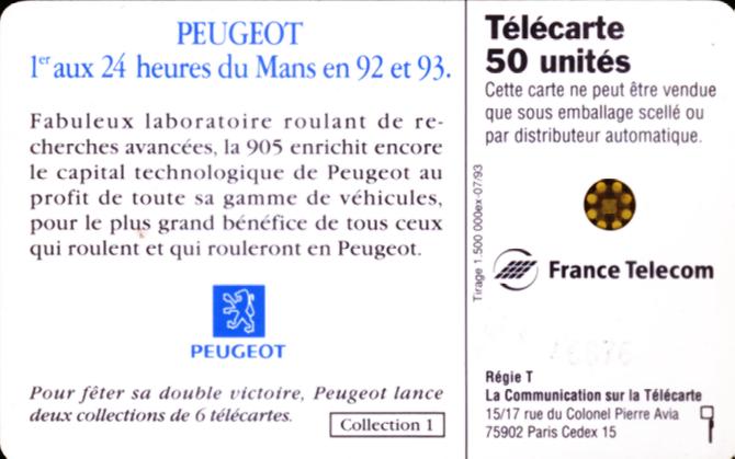 Pour fêter ses victoires au Mans, Peugeot se fendra même de deux collections de six télécartes. J'ai la collection complète (il m'en manquait 11, mais grâce aux sites de vente aux enchères et un peu de patience on peut les trouver à bon prix), pour ne pas alourdir la page, les 12 télécartes sont visibles ici.